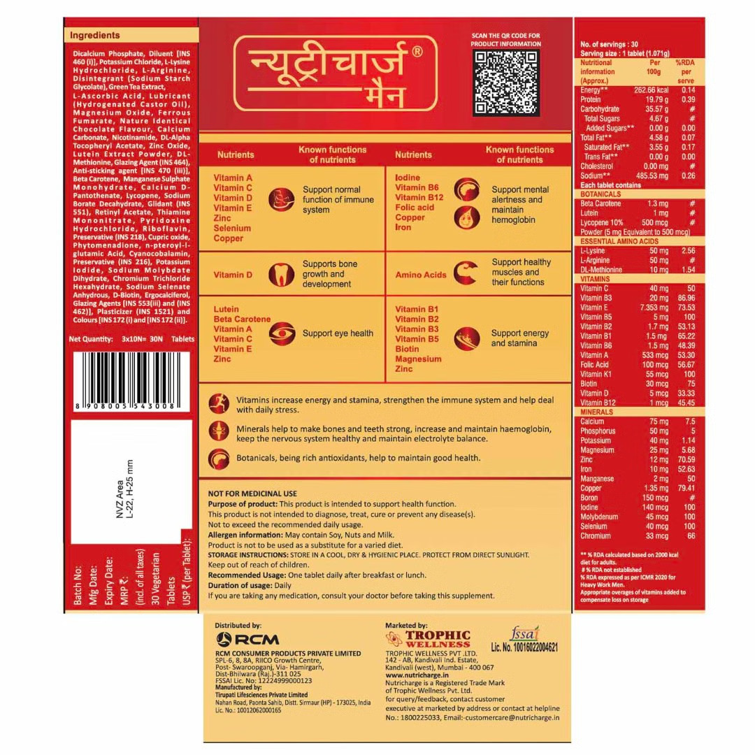 Nutricharge Man offers 33 essential nutrients packed with vitamins, minerals, amino acids & botanicals that bridge the nutritional gap with appropriate levels of nutrients in the bio-effective form.